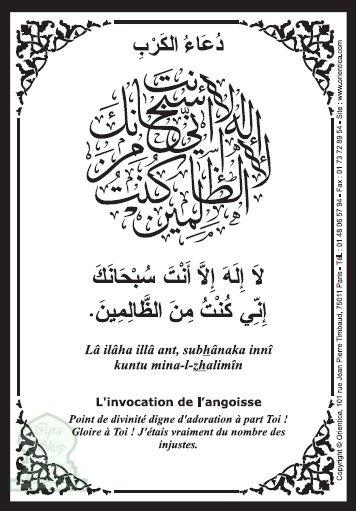 Invocation en cas d'angoisse, de peur ou de détresse. Il s'agit du verset coranique : "Pas de divinité digne d'adoration à par Toi ! Gloire à Toi ! J'étais vraiment du nombre des injustes !"