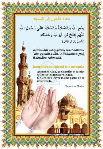 Invocation d'entrée à la mosquée : "Au nom d'Allâh, que la prière et le salut soient sur le Messager d'Allâh. Ô Seigneur ! Ouvre-moi les portes de Ta miséricorde." (Rapporté par Muslim)
