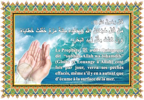 Le prophète (PSL) a dit: " Quiconque dit 'subhan-Allah wa bihamdih' - Gloire et Louange à Allah - cent fois par jour, verra ses pêchés effacés, même s'il y en a autant que d'écume à la surface de la mer."