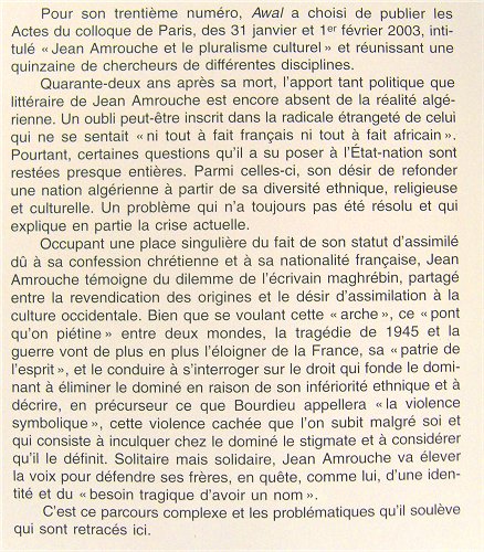 Pour son trentième numéro, Awal a choisi de publier les Actes du colloque de Paris, des 31 janvier et 1er février 2003, intitulé " Jean Amrouche et le pluralisme culturel " et réunissant une quinzaine de chercheurs de différentes disciplines. Quarante-deux ans après sa mort, l'apport tant politique que littéraire de Jean Amrouche est encore absent de la réalité algérienne. Un oubli peut-être inscrit dans la radicale étrangeté de celui qui ne se sentait " ni tout à fait français ni tout à fait africain ". Pourtant, certaines questions qu'il a su poser à l'État-nation sont restées presque entières. Parmi celles-ci, son désir de refonder une nation algérienne à partir de sa diversité ethnique, religieuse et culturelle. Un problème qui n'a toujours pas été résolu et qui explique en partie la crise actuelle. Occupant une place singulière du fait de son statut d'assimilé dû à sa confession chrétienne et à sa nationalité française, Jean Amrouche témoigne du dilemme de l'écrivain maghrébin, partagé entre la revendication des origines et le désir d'assimilation à la culture occidentale. Bien que se voulant cette " arche ", ce " pont qu'on piétine " entre deux mondes, la tragédie de 1945 et la guerre vont de plus en plus l'éloigner de la France, sa " patrie de l'esprit ", et le conduire à s'interroger sur le droit qui fonde le dominant à éliminer le dominé en raison de son infériorité ethnique et à décrire, en précurseur ce que Bourdieu appellera " la violence symbolique ", cette violence cachée que l'on subit malgré soi et qui consiste à inculquer chez le dominé le stigmate et à considérer qu'il le définit. Solitaire mais solidaire, Jean Amrouche va élever la voix pour défendre ses frères, en quête, comme lui, d'une identité et du " besoin tragique d'avoir un nom ". C'est ce parcours complexe et les problématiques qu'il soulève qui sont retracés ici.