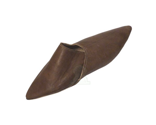 Babouche homme citadine FASSI, fabriqué en cuir traité, de couleur marron ; cette babouche est simple et possède une extrémité pointue.