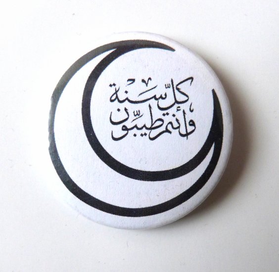 Badge avec calligraphie de l'expression arabe كل سنة وأنتم طيبون. Nous vous souhaitons de bien vous porter durant toute l'année.