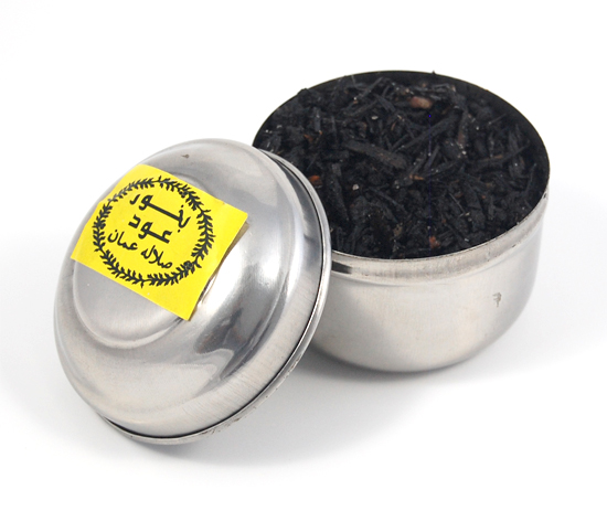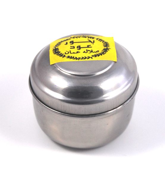 Bakhour (encens) "Salalah Oman" à base de bois de oudh parfumé. Dans une boite métallique argentée.