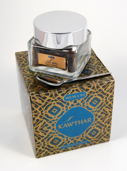 Encens (bakhour - بخور) Hémani "Kawthar" (le nom d'un fleuve du Paradis), à base de poudre de bois et de parfum, dans un bocal à utiliser dans un bruleur d'encens (encensoir) ou sur un charbon incandescent. Fourni avec une cuillère de dosage métallique.