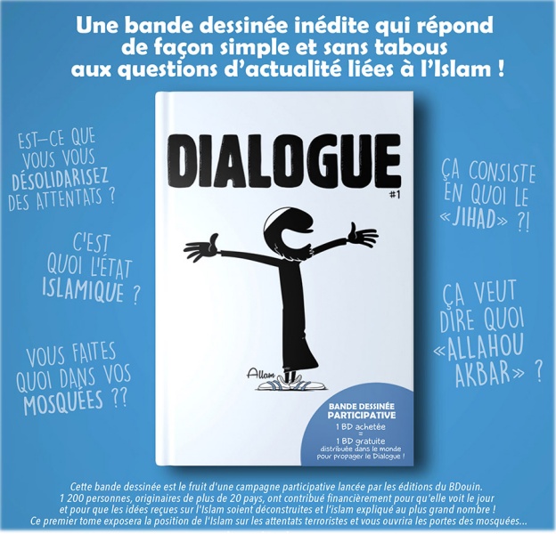 La bande dessinée "Dialogue" est unique en son genre car fruit d'une campagne participative lancée par les éditions du BDouin et ce, afin de déconstruire les idées reçues sur l'Islam, qu'elle se propose d’expliquer au plus grand nombre !