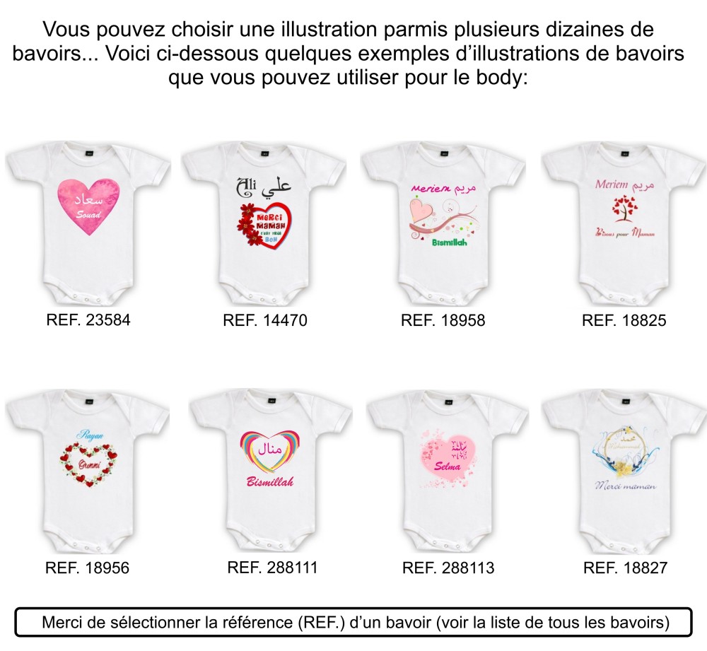 Pour ce body, vous devez choisir une illustration d'un bavoir. Voir la liste des bavoirs ci-dessous et indiquez la Référence (REF.) du bavoir choisi, puis entrez le reste des informations dans les champs ci-dessous :