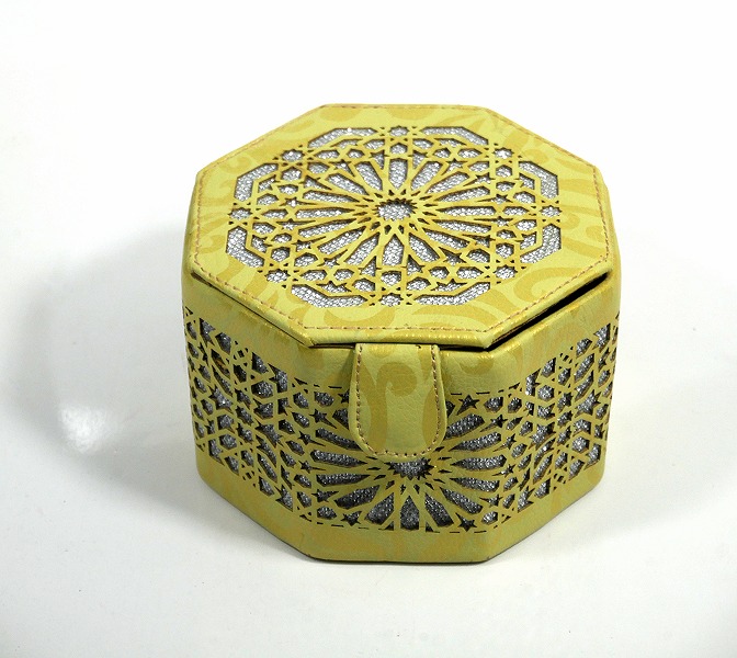 Boite de Rangement artisanale de forme octogonale en cuir avec des jolies motifs argentes - Couleur jaune