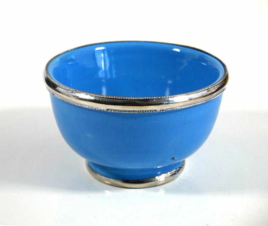 Bol moyen en poterie marocain de couleur bleu clair emaille et cercle de metal argente