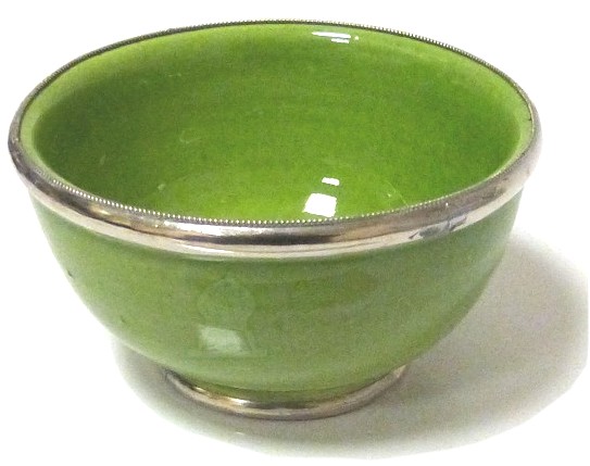 Joli récipient vert, de taille moyenne, en poterie, de provenance de Marrakech (Maroc), émaillé et cerclé de métal ornemental argenté légèrement ciselé.