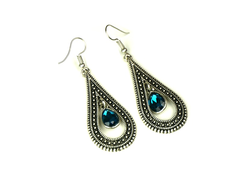 Boucles d'oreilles pendantes en métal argenté ciselé serties de pierres bleu clair Vetement & Accessoire