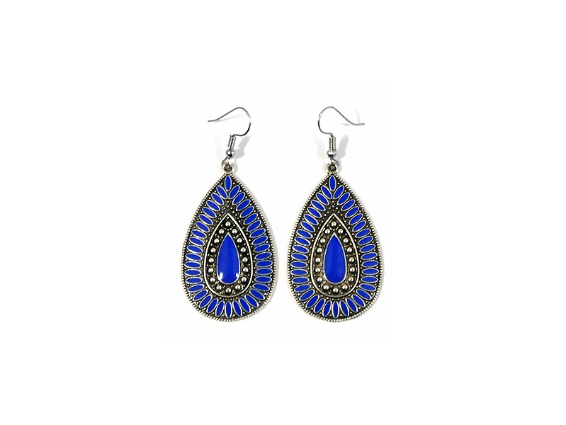 Boucles d'oreilles pendantes en métal argenté ciselé serties de pierres bleu roi - REF. 29558 (5.90 €)