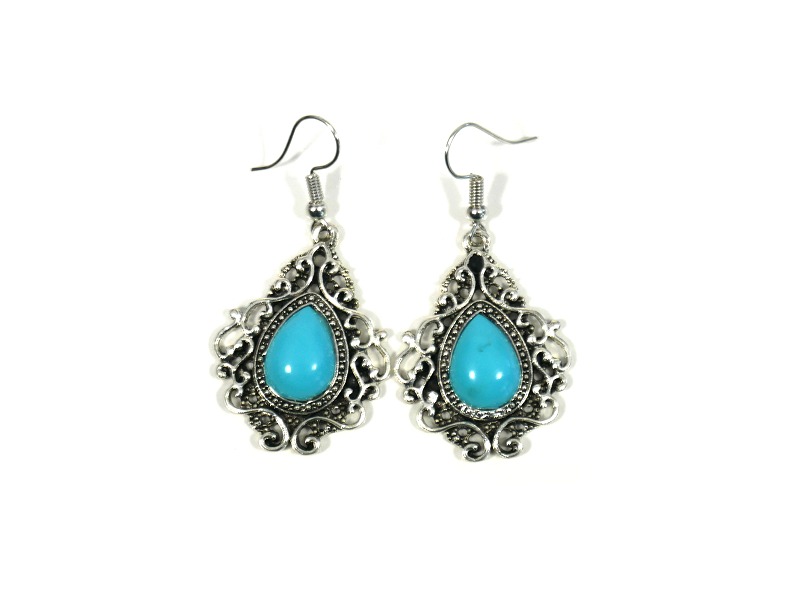 Boucles d'oreilles pendantes en métal argenté ciselé serties de pierres bleu Vetement & Accessoire