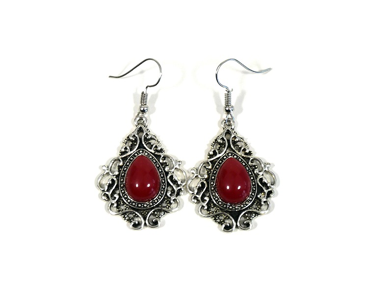 Boucles d'oreilles pendantes en métal argenté ciselé serties de pierres bordeaux  Vetement & Accessoire