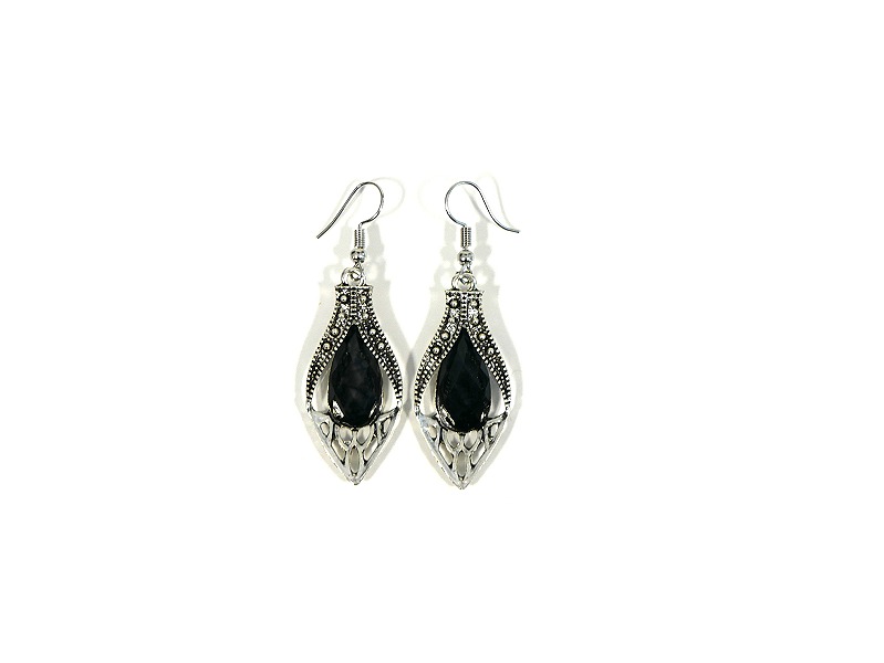 Boucles d'oreilles pendantes en métal argenté ciselé serties de pierres noir - REF. 29577 (5.90 €)