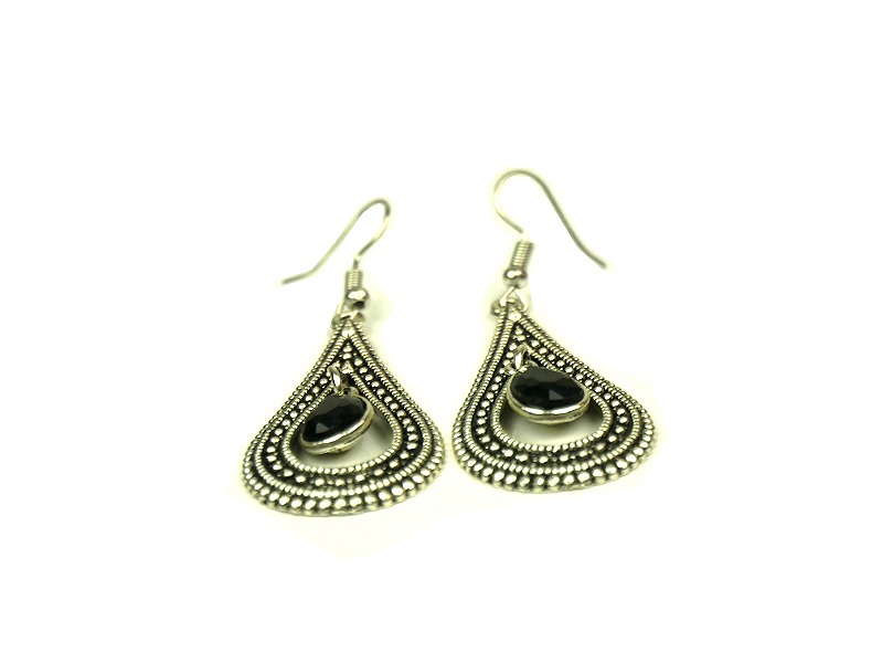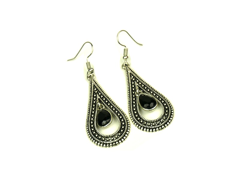 Boucles d'oreilles pendantes en métal argenté ciselé serties de pierres noir Vetement & Accessoire