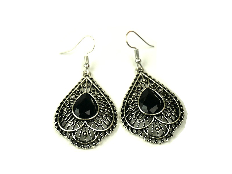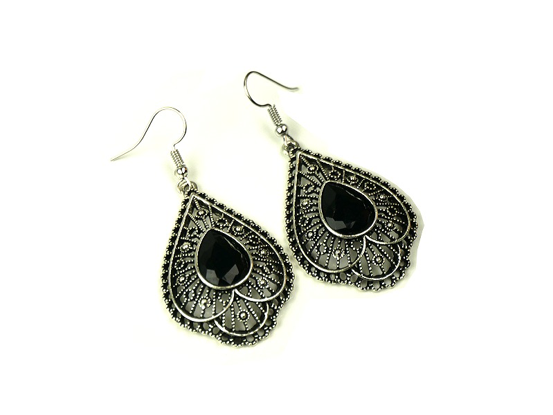 Boucles d'oreilles pendantes en métal argenté ciselé serties de pierres noir Vetement & Accessoire