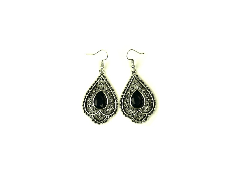 Boucles d'oreilles pendantes en métal argenté ciselé serties de pierres noir - REF. 29632 (5.90 €)