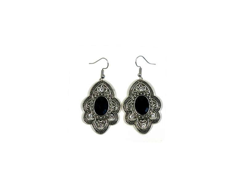 Boucles d'oreilles pendantes en métal argenté ciselé serties de pierres noir - REF. 29577 (5.90 €)