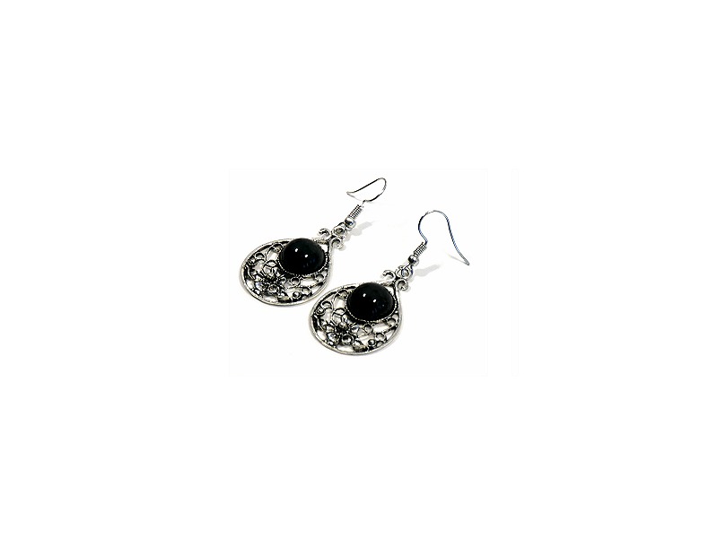 Boucles d'oreilles pendantes en métal argenté ciselé serties de pierres noir - REF. 29702 (5.90 €)
