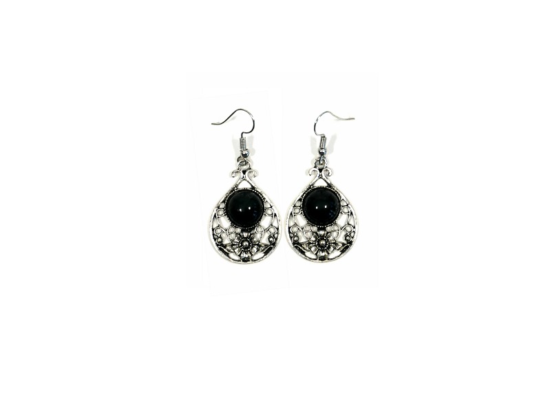 Boucles d'oreilles pendantes en métal argenté ciselé serties de pierres noir - REF. 29617 (5.90 €)