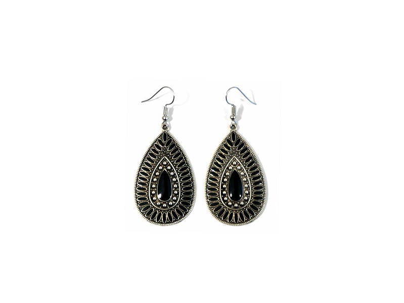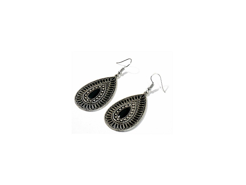 Boucles d'oreilles pendantes en métal argenté ciselé serties de pierres noir  Vetement & Accessoire