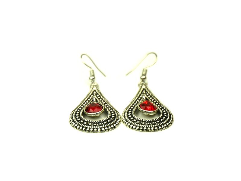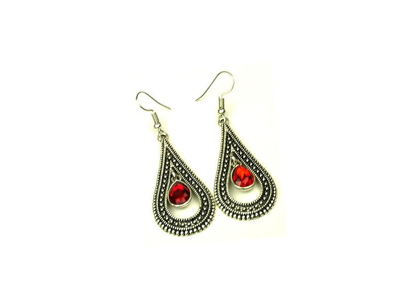 Boucles d'oreilles pendantes en métal argenté ciselé serties de pierres rouge - REF. 29544 (5.90 €)