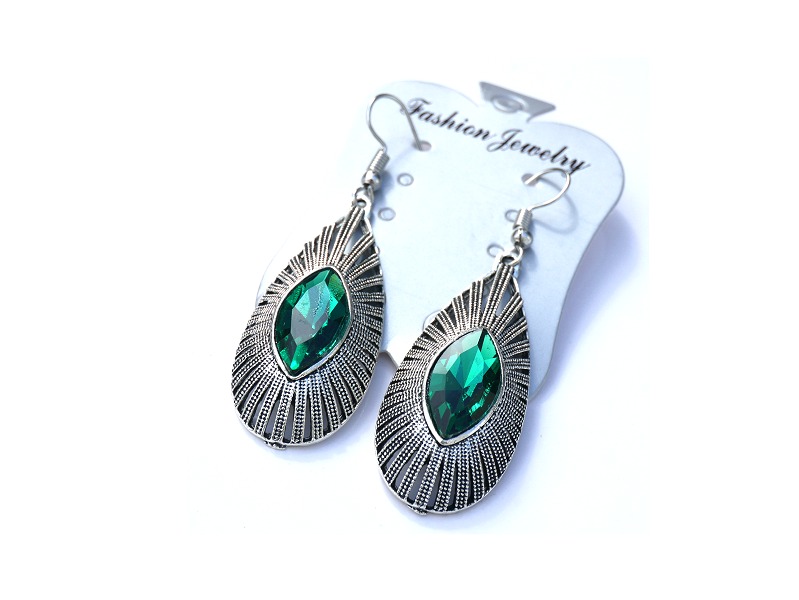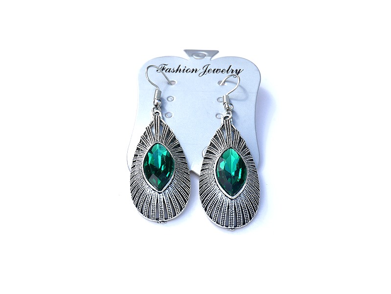 Boucles d'oreilles pendantes en métal argenté ciselé serties de pierres vert - REF. 29562 (5.90 €)