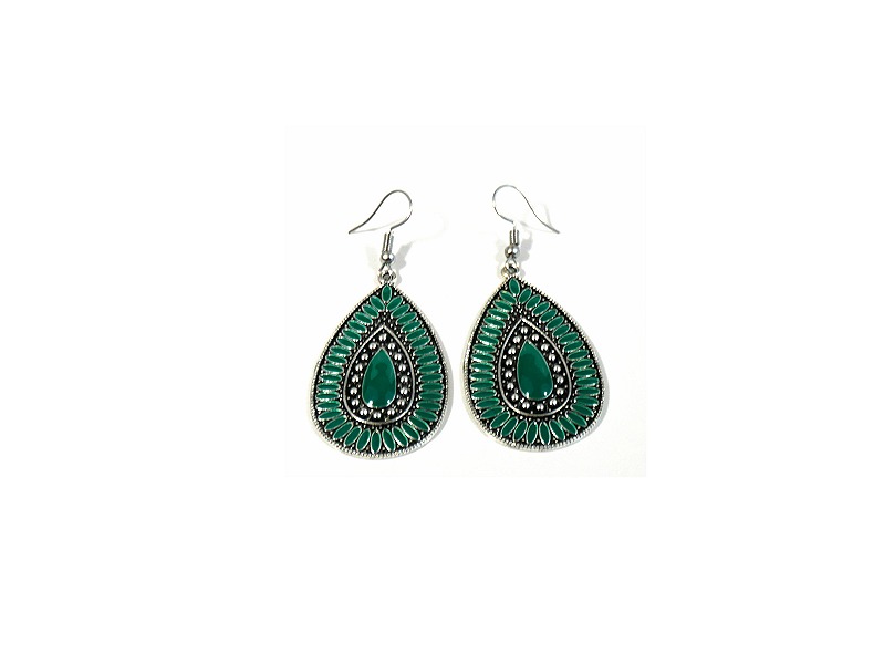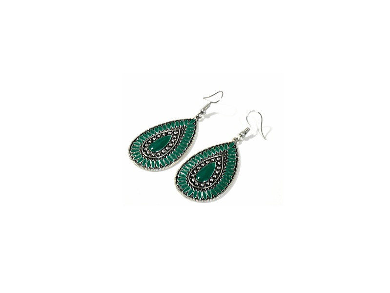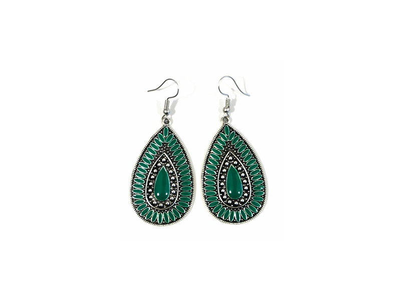 Boucles d'oreilles pendantes en métal argenté ciselé serties de pierres vert - REF. 29556 (5.90 €)