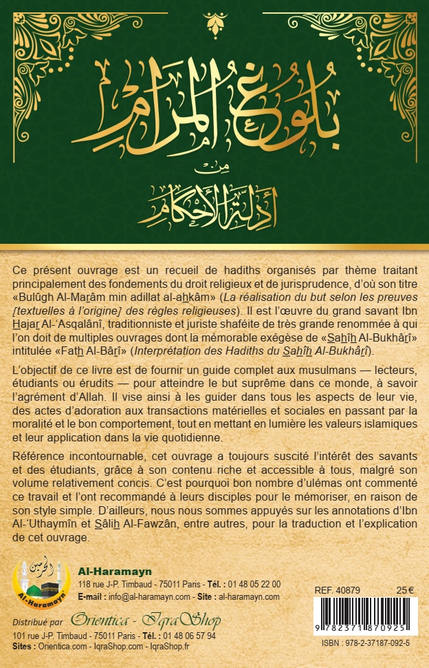 Boulough Al-Maram (Bilingue français-arabe) avec commentaires (Bulûgh Al-Marâm min adillat al-ahkâm) - REF. 40879 (25.00 €)
