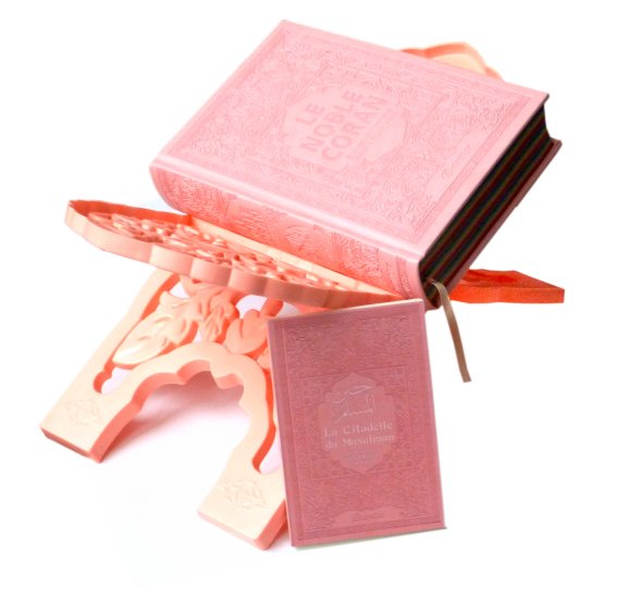 Pack cadeau de luxe rose clair pour femmes : Le Saint Coran, La Citadelle (français/arabe/phonétique) + Porte Coran + Tapis + Chapelet + Parfum Musc pour femme - REF. 24004 (55.00 €)