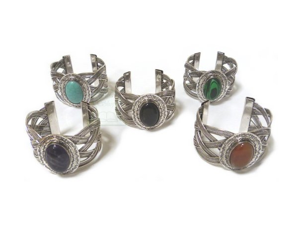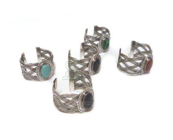 Jolis bracelets ovales, ajustables au poignet, fabriqués en métal argenté, joliment ciselé, et ornés de pierres en différentes couleurs...
