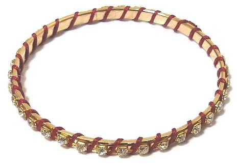 Bracelet fantaisie femme en métal doré orné de pierres cristallines et enroulé de fil brillant rouge - REF. 15333 (2.00 €)