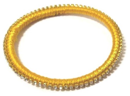 Bracelet fantaisie pour femmes, semi rigide, confectionné artisanalement en fil brillant de couleur jaune unie, et serti de jolies pierres cristallines...