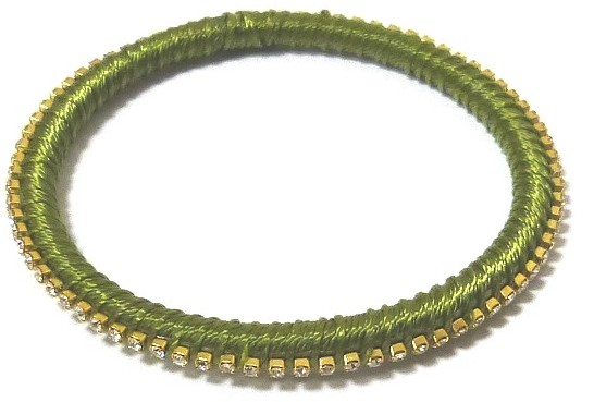 Bracelet fantaisie pour femmes, semi rigide, confectionné artisanalement en fil brillant de couleur verte unie, et serti de jolies pierres cristallines...