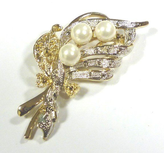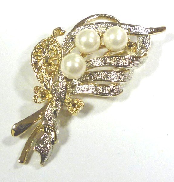 Broche avec parties dorees et argentees et 3 grosses perles blanches