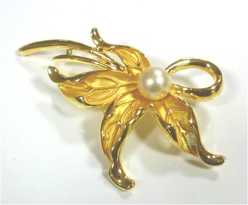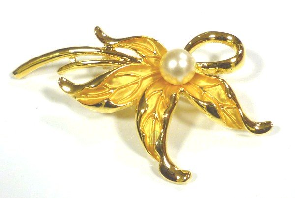 Broche dorée sous forme d'une feuille au milieu de laquelle loge une grosse perle blanche.