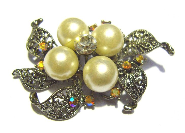 Broche métallique en forme de fleur argentée avec perles noires et blanches - REF. 13290 (3.50 €) - En Promotion à 2.50 €