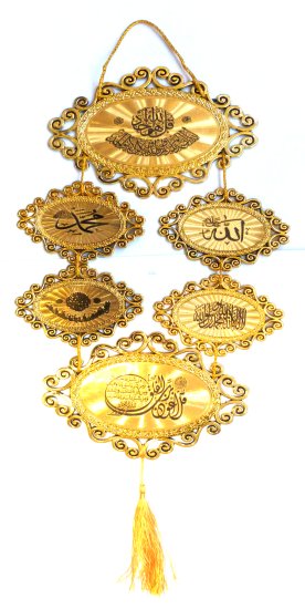 Beau cadre doré constitué de 6 parties ovales dans lesquelles vous trouverez des invocations et des sourates écrites en calligraphie islamique. Il contient : Sourate Falaq, sourate al-Ikhlass, l'inscription "Allah", L'attestation de foi, Sourate An-Nass, l'inscription "Muhamed" (SAW).