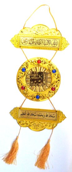 Superbe décoration islamique entièrement dorée constituée d'une partie ronde au centre avec l'attestation de la foi calligraphiée ainsi que de deux autres parties rectangulaires en haut et en bas contenants des invocations. Notez les pompons tout mignons suspendus à l'objet.