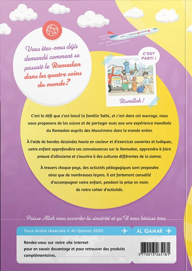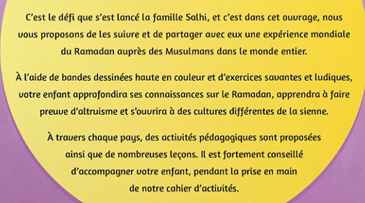 Ce manuel vous propose de visiter cinq pays différents et d'envisager le Ramadan avec un œil neuf. Adapté pour les enfants, dès 8 ans, ce livre propose de nombreuses activités ludiques pour permettre à votre enfant d'apprendre et de comprendre ce merveilleux mois sacré qu'est le Ramadan. Rejoignez votre famille préférée, la famille Salhi et accompagnez-la à travers ses aventures tout autour du monde. Allez, c'est parti !
