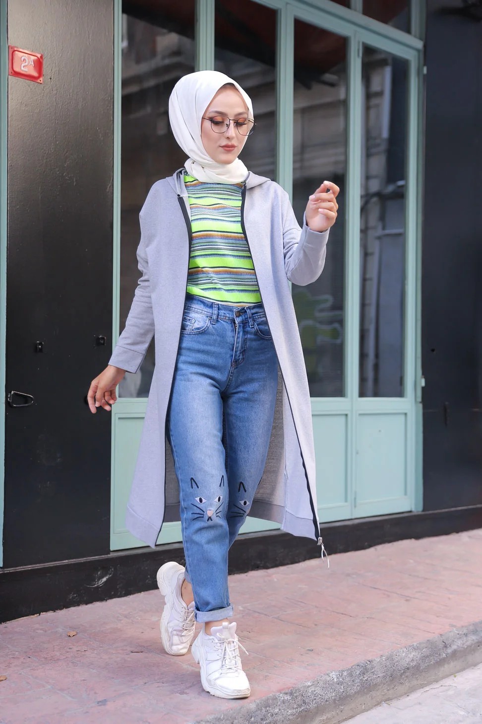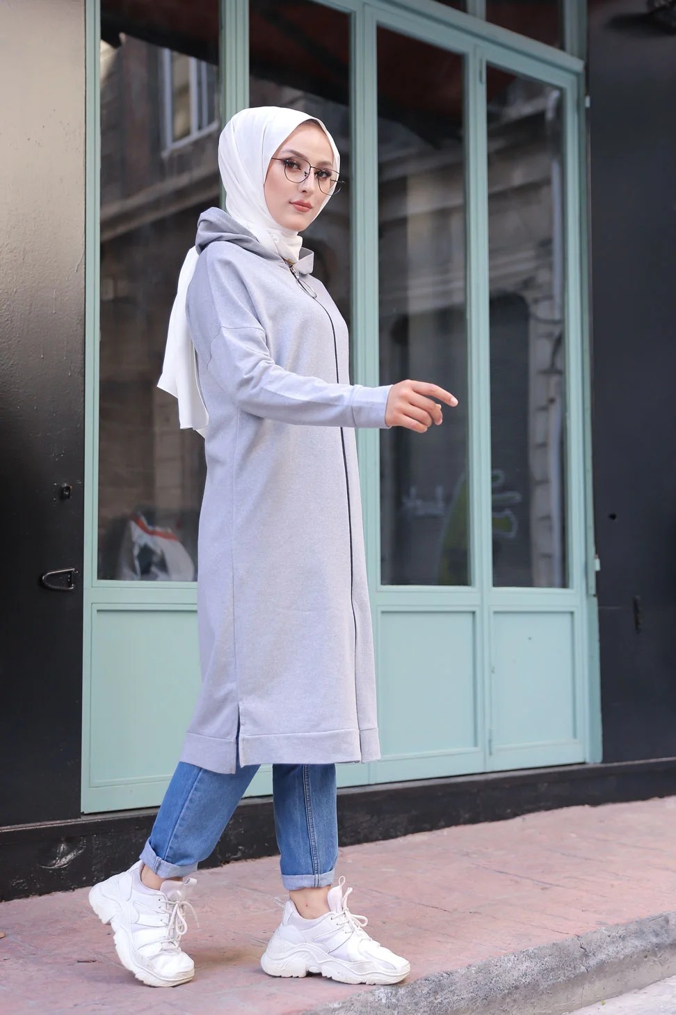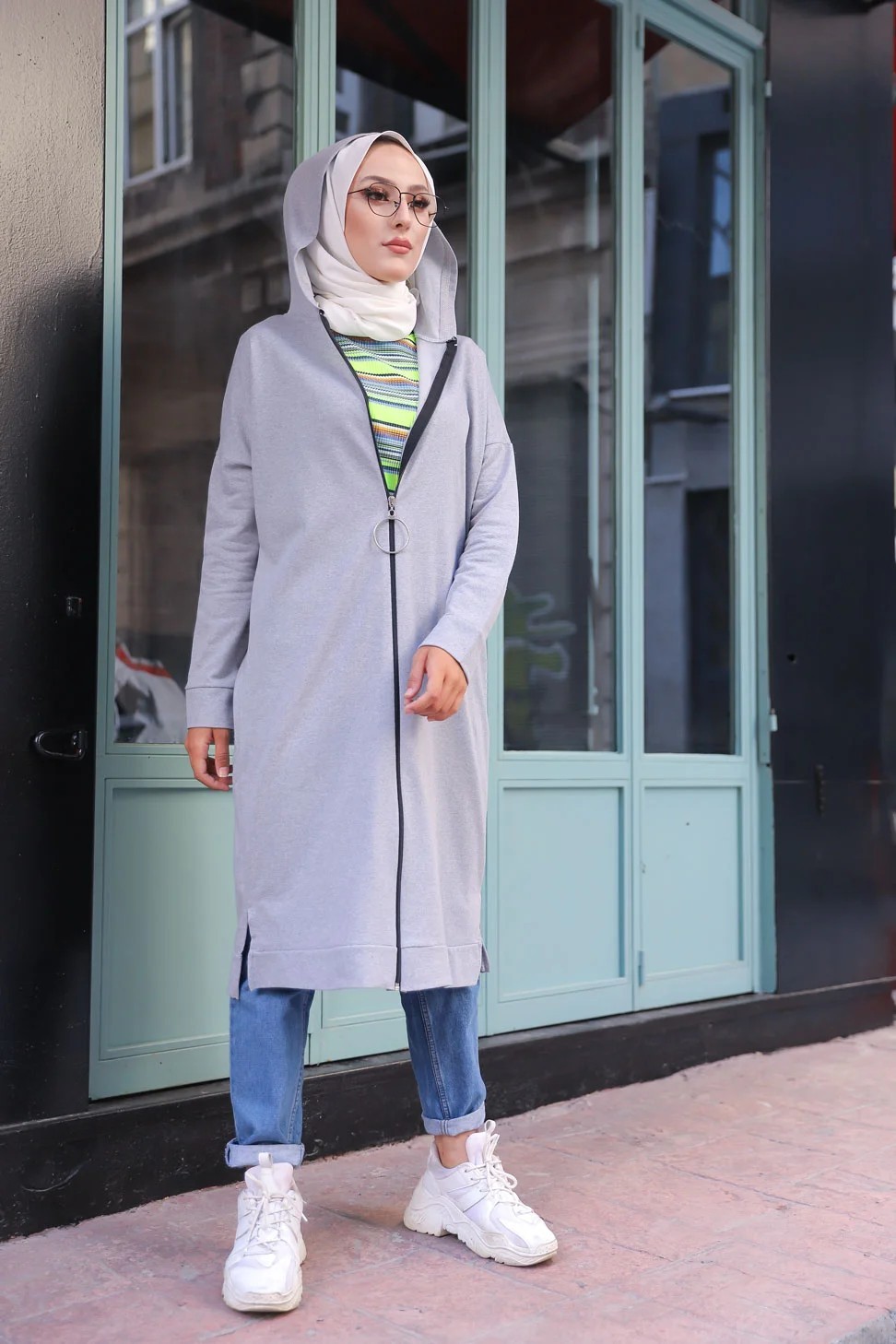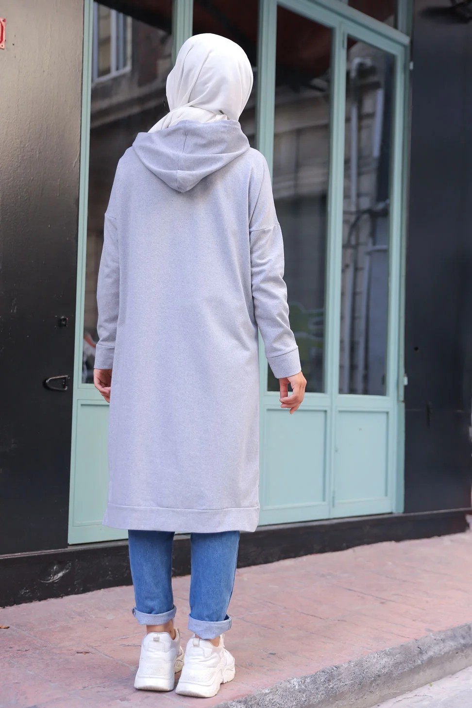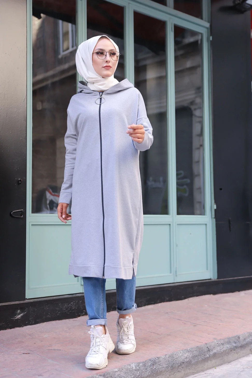 Cardigan Gilet long zippe style hijab sportswear col a capuche pour femme voilee - Couleur gris clair
