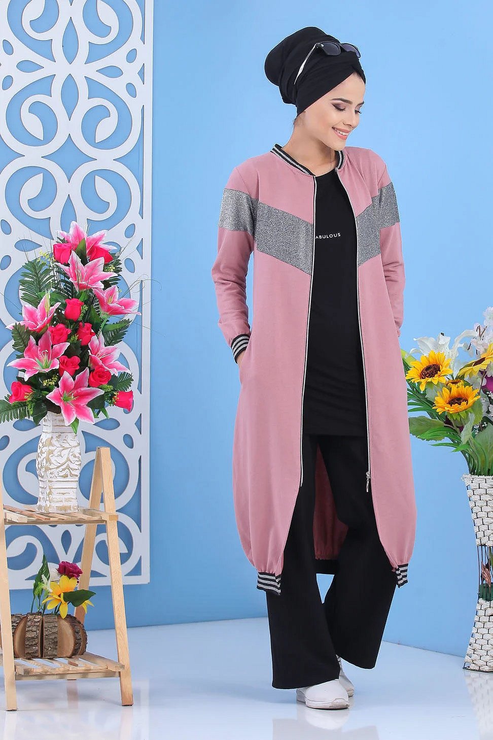 Cardigan long pour femme (Robe zippée à capuche style Sportswear pour femme voilée) - Couleur noir et rose - REF. 33217 (29.90 €)