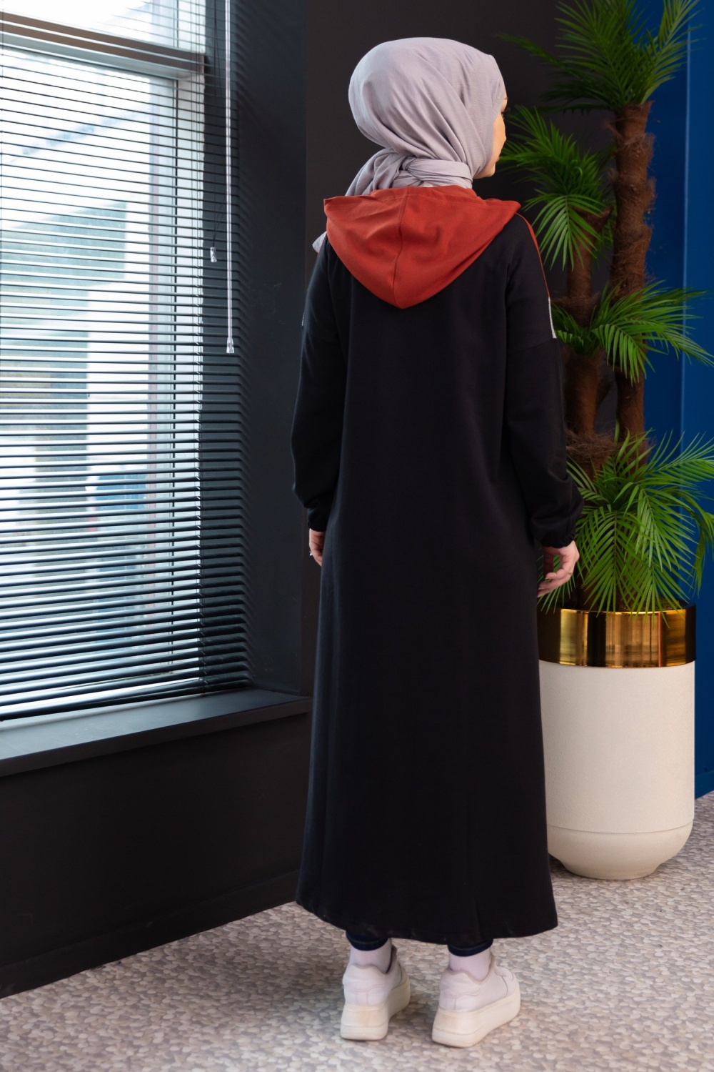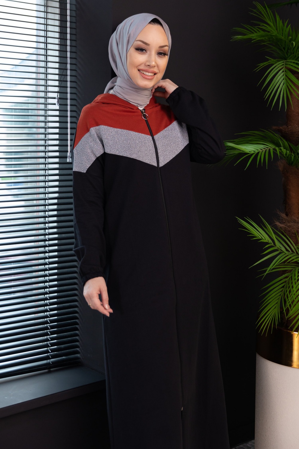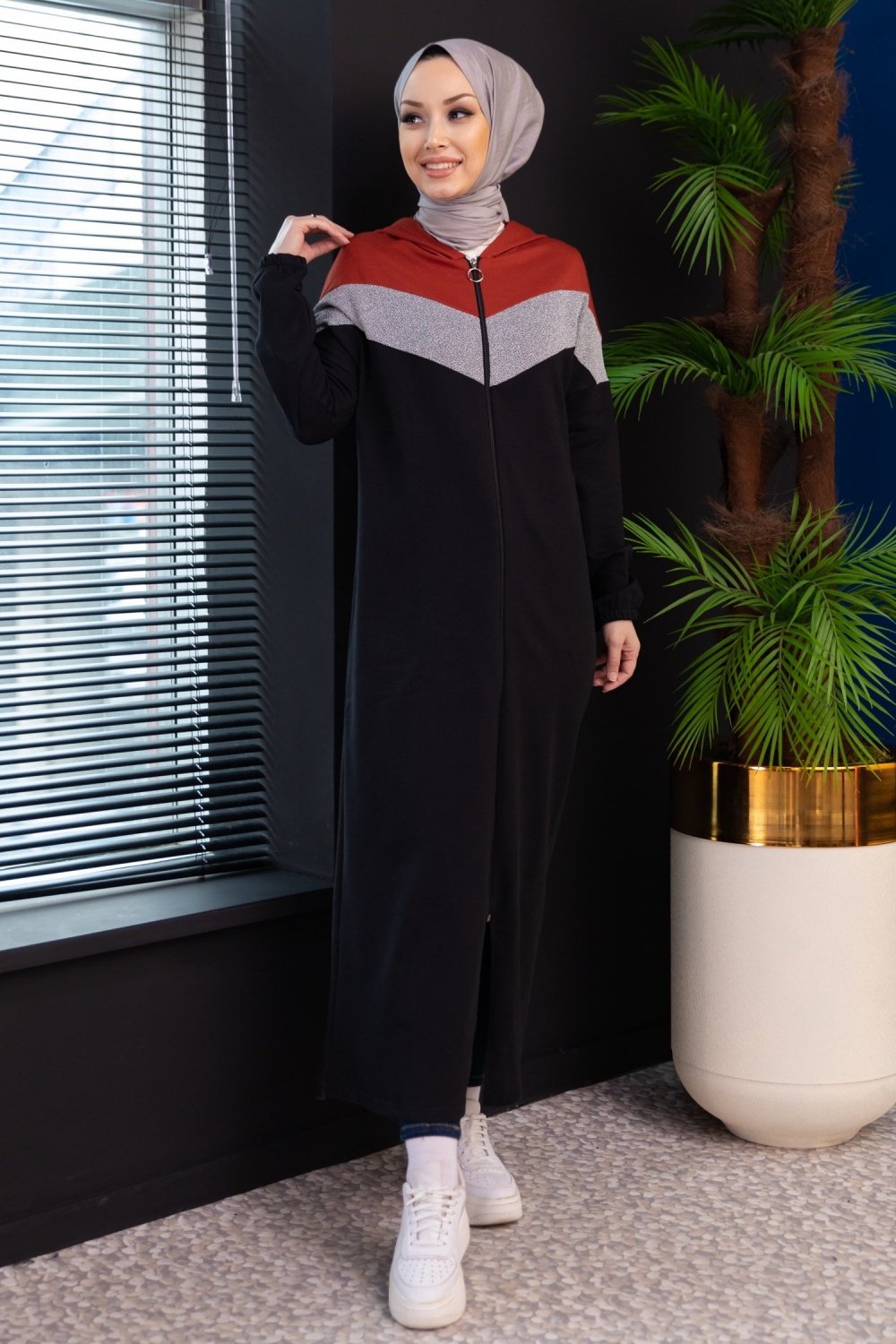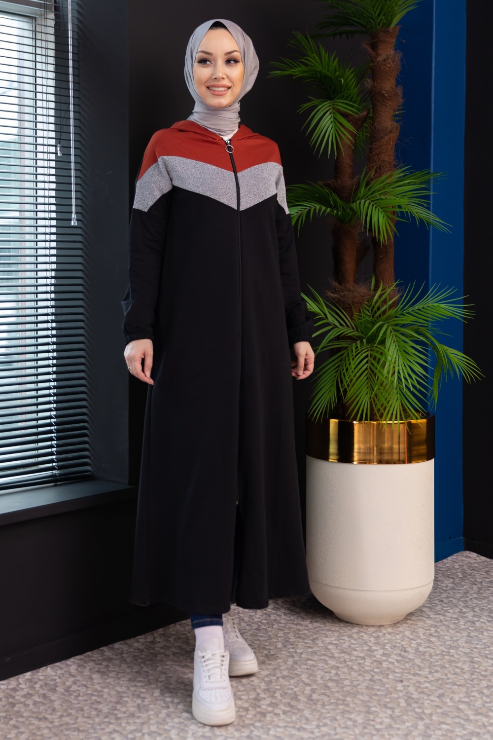 Cardigan long a capuche avec partie argentee - Robe zippee style moderne pour femme voilee - Couleur noir et brique