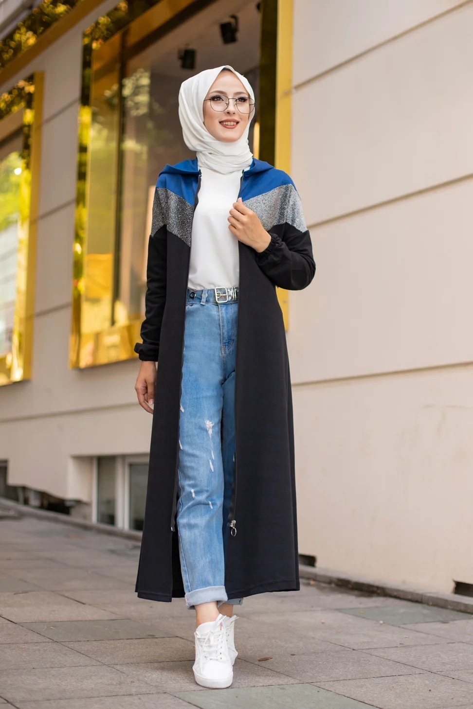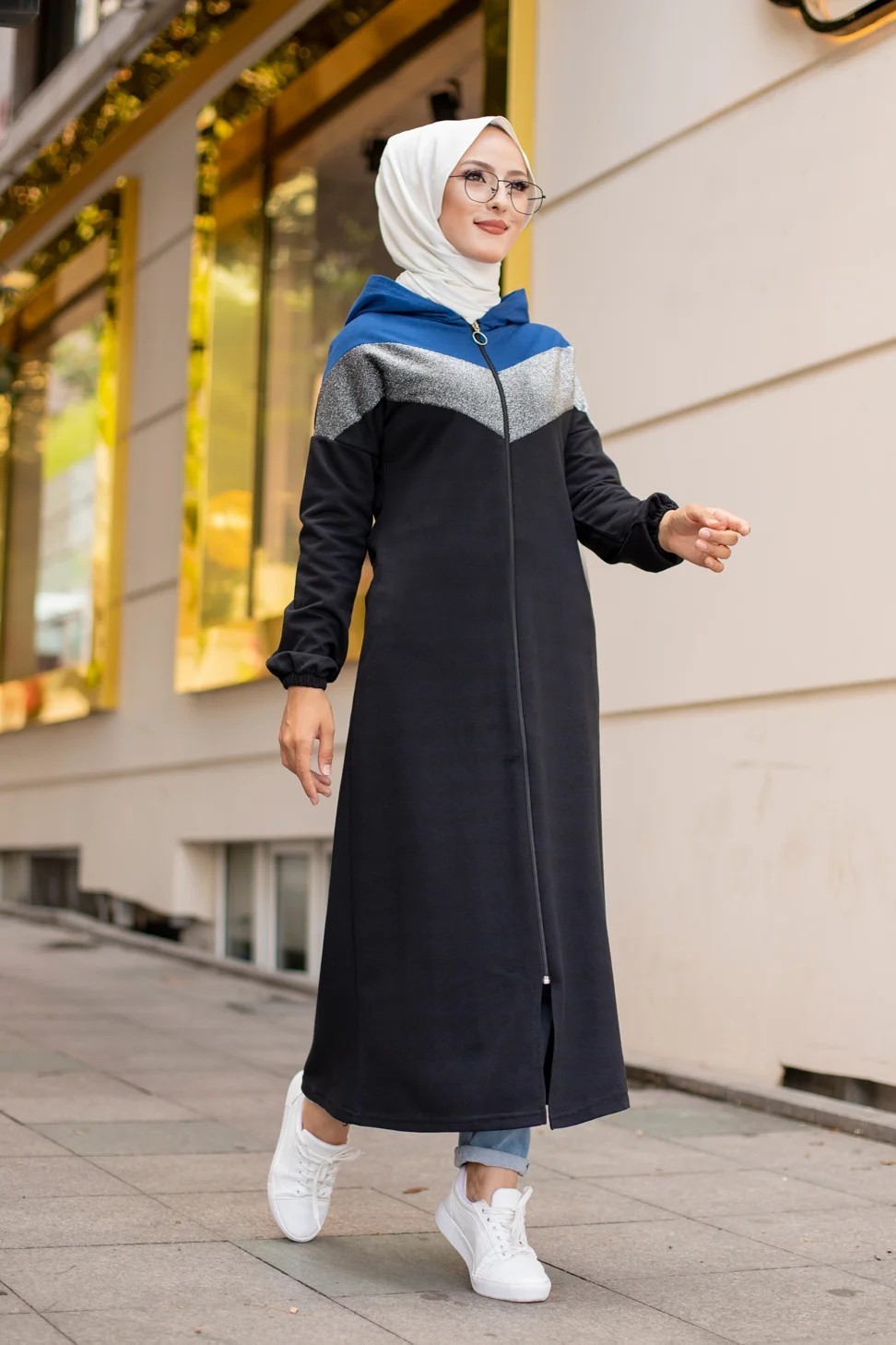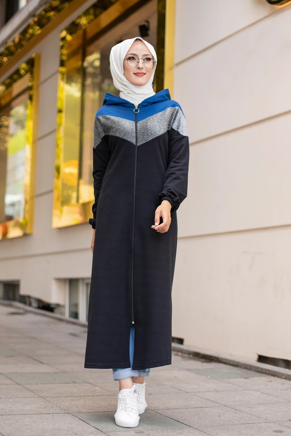 Cardigan long à capuche avec partie argentée - Robe zippée style sport pour femme voilée - Couleur noir, gris et bleu Vetement & Accessoire