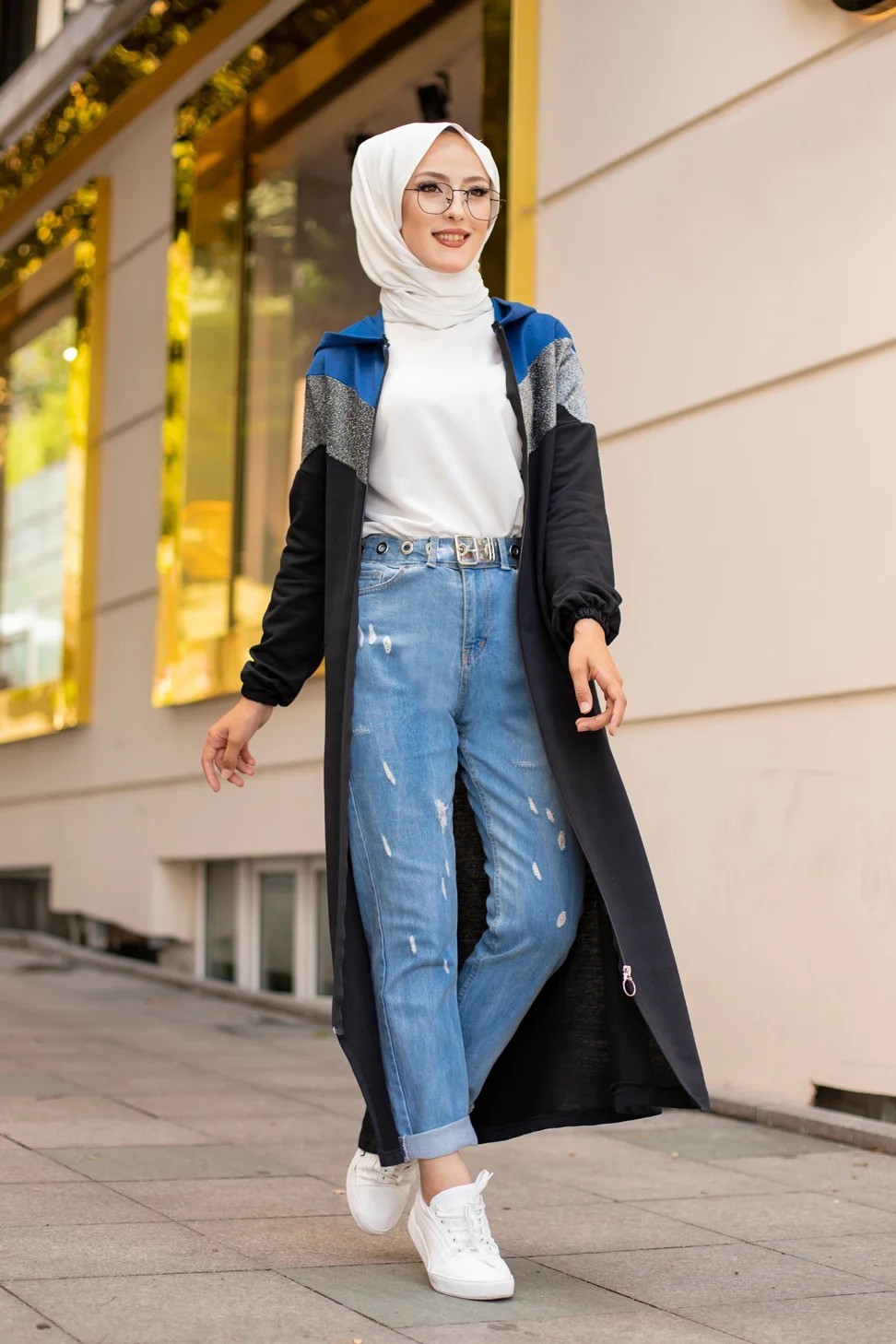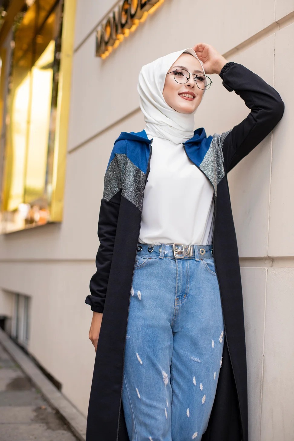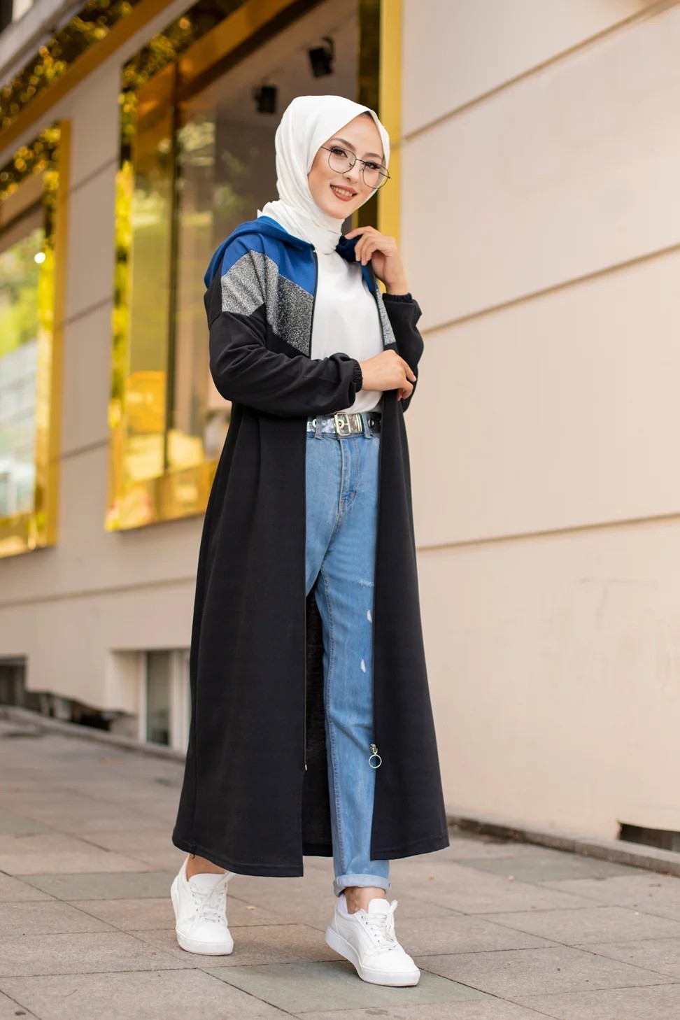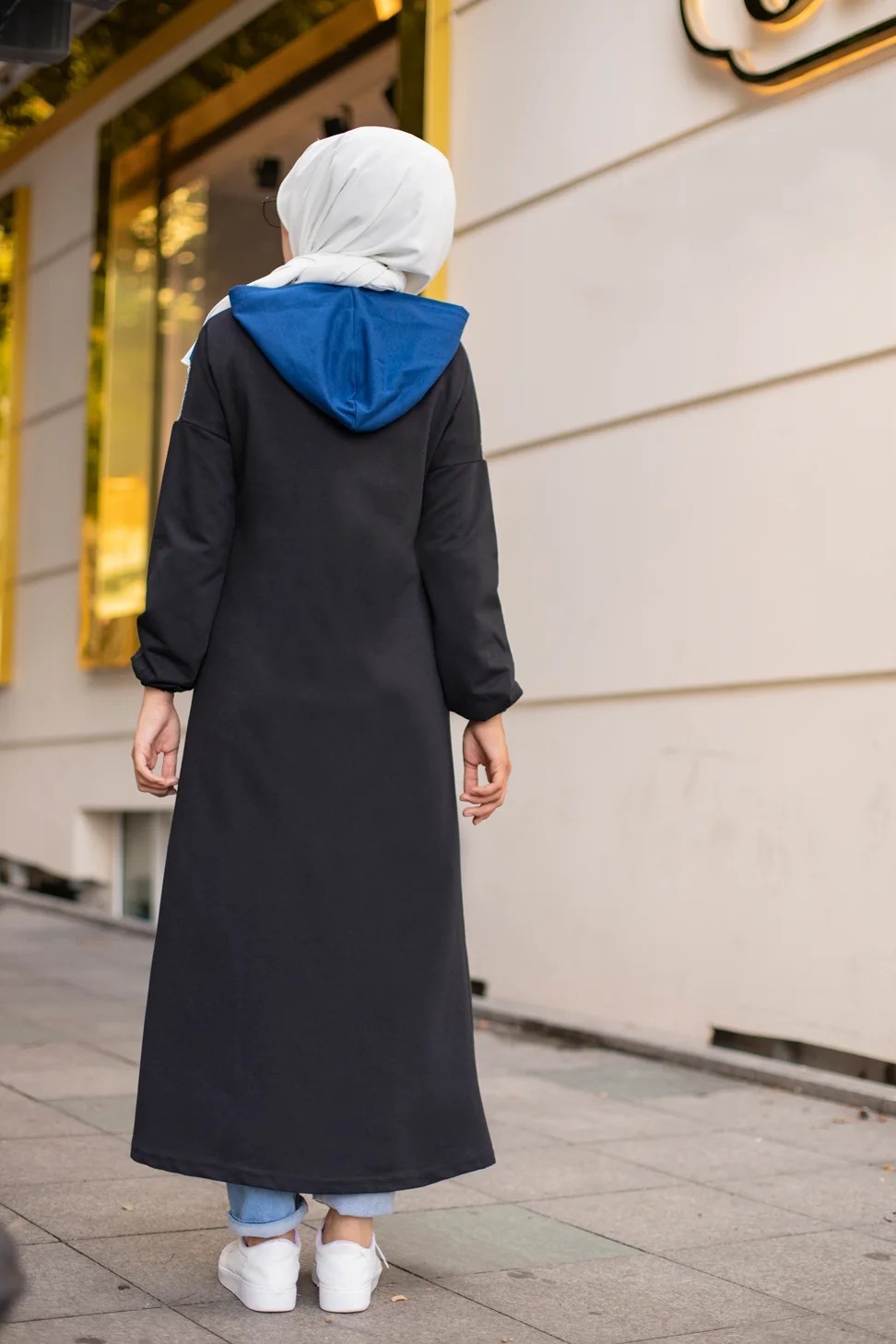 Cardigan long à capuche avec partie argentée - Robe zippée style sport pour femme voilée - Couleur noir, gris et bleu Vetement & Accessoire