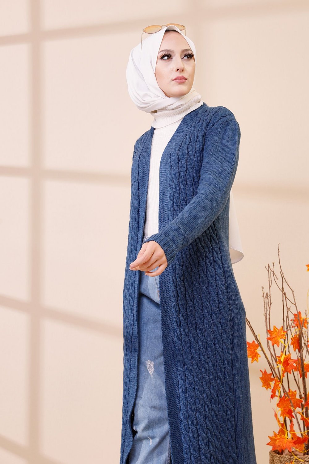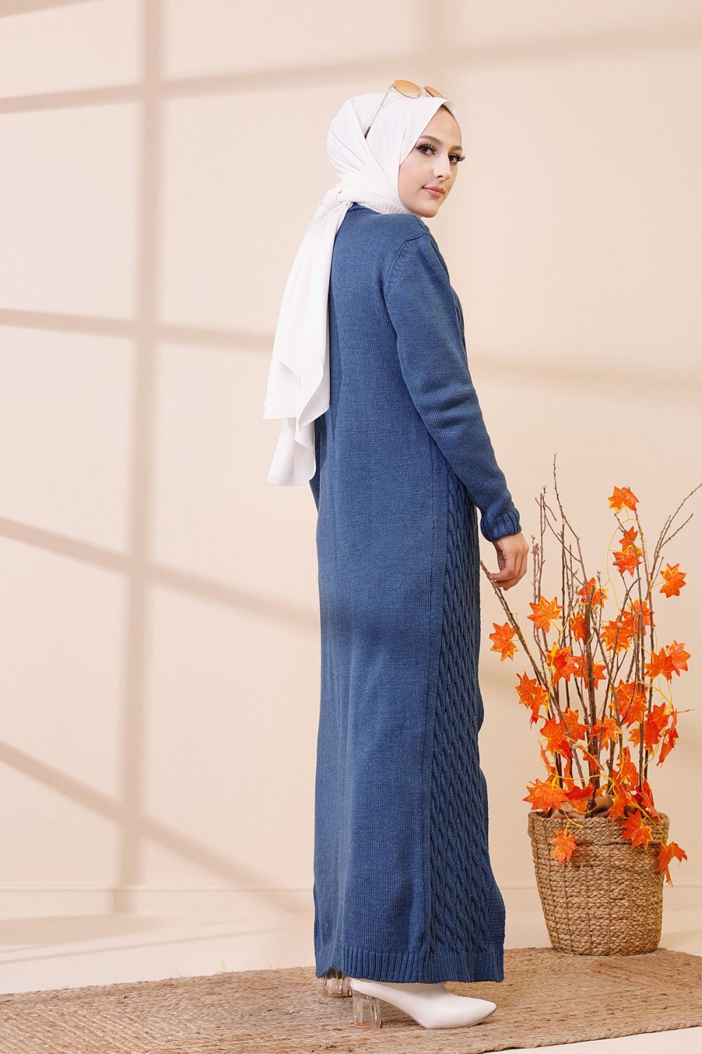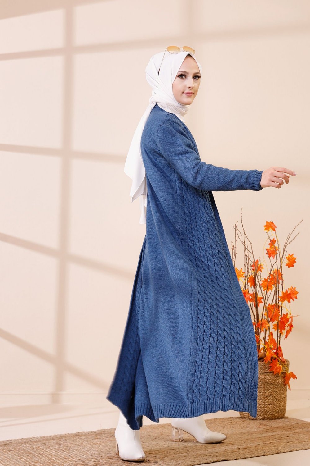 Cardigan maxi-long tricoté en grosse maille (Vêtement Hijab Automne Hiver pour femme) - Couleur bleu indigo Vetement & Accessoire