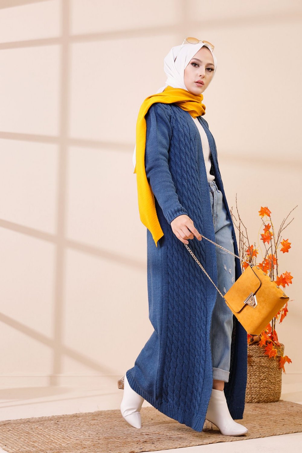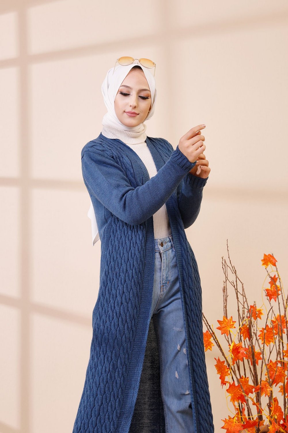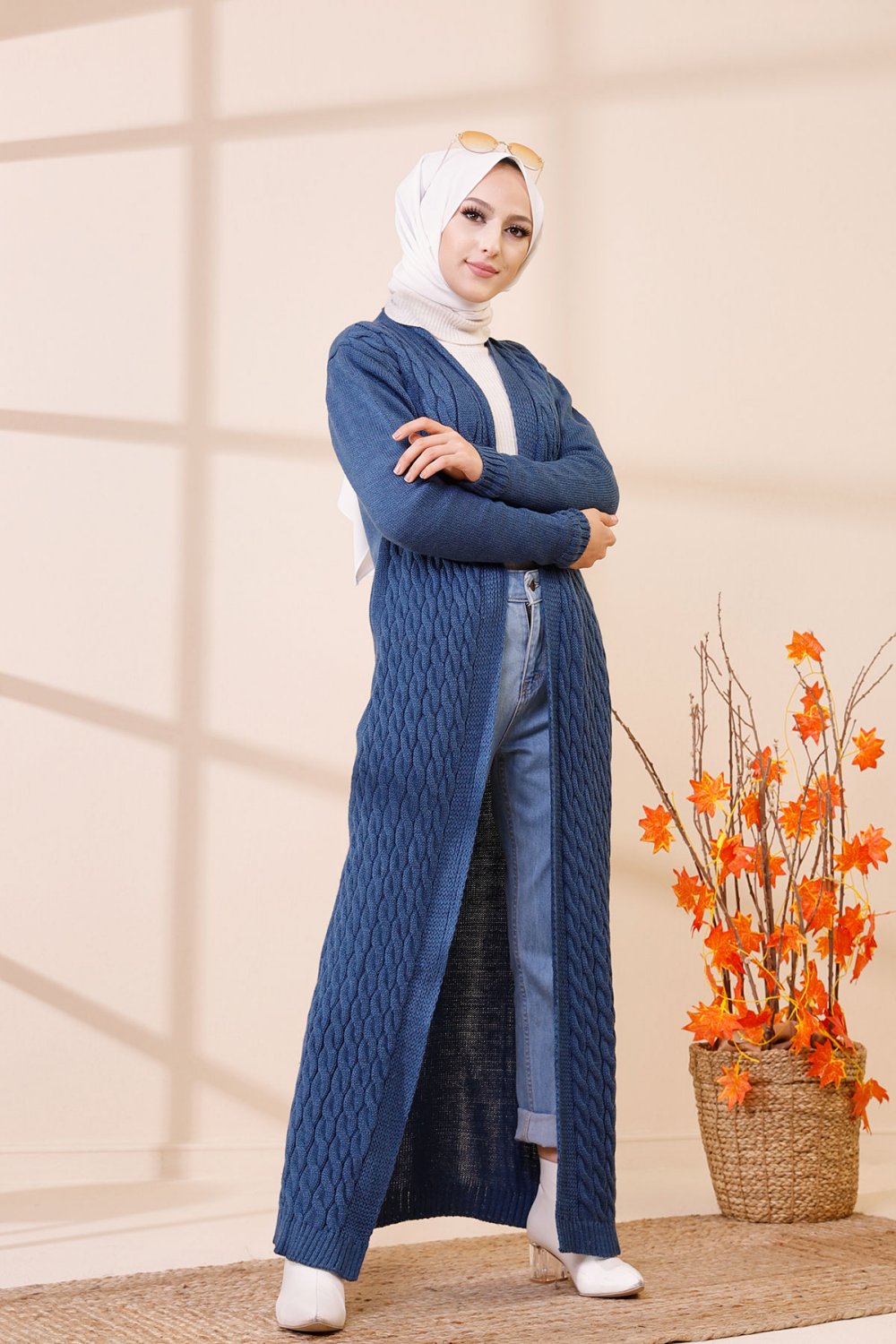 Cardigan maxi-long tricoté en grosse maille (Vêtement Hijab Automne Hiver pour femme) - Couleur bleu indigo Vetement & Accessoire