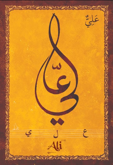 Jolie carte postale représentant le prénom arabe Ali calligraphié en arabe ainsi que son épellation lettre par lettre en arabe. Derrière la carte postale se trouve la signification du prénom.