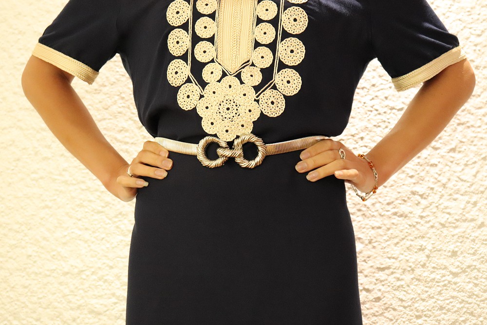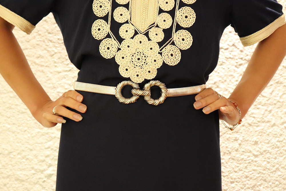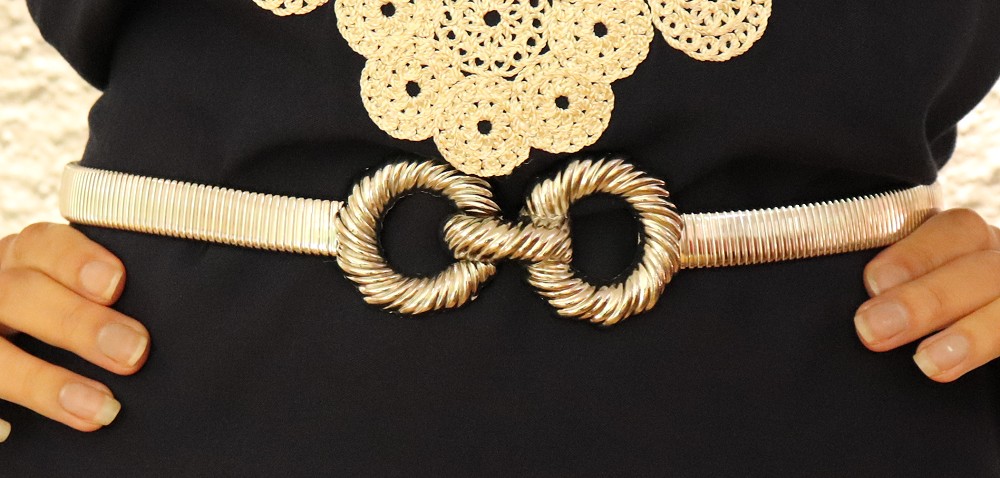 Ceinture argentée, élastique, fermeture à laide d'un crochet dissimulé sous l'une des boucles.
