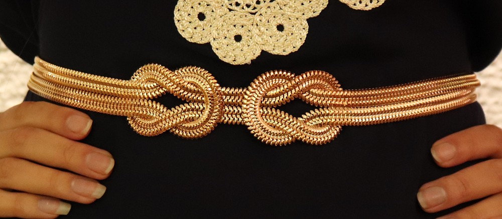 Ceinture dorée, motifs boucles croisées sur le devant, fermeture mousqueton, chaine fine ajustable.